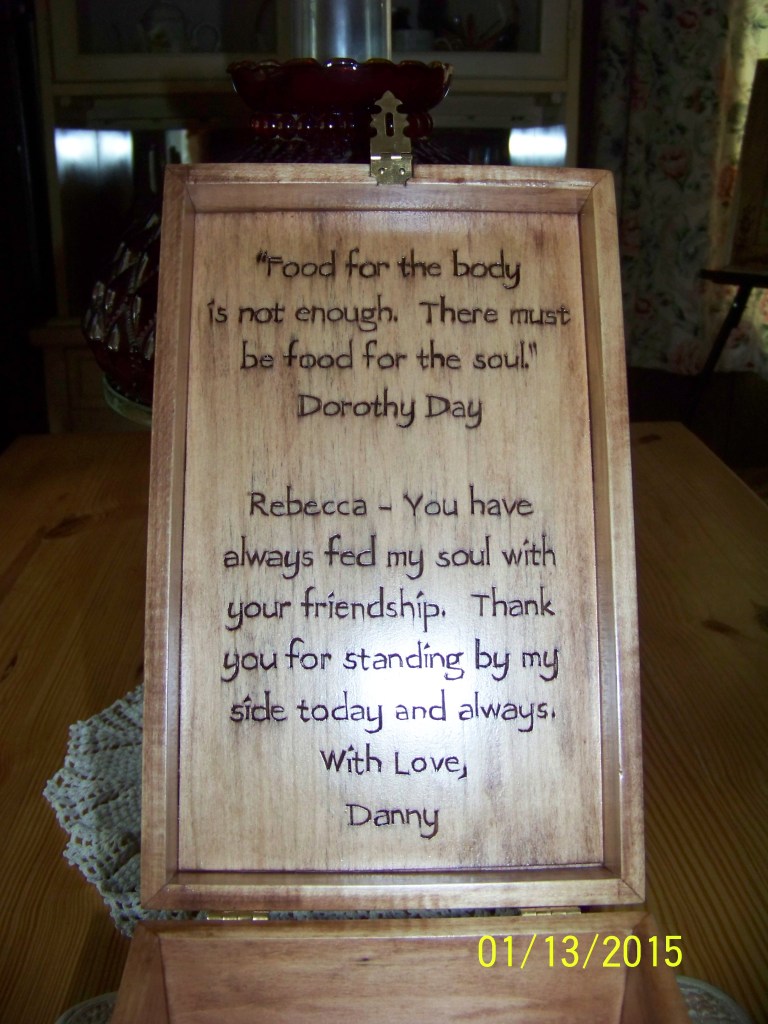 Note: I am willing to make custom special request items if it is something I am capable of doing. From time to time, I have had customers request, in the case of box items, either a person’s name or monogram, or such things as bible verses, favorite poems, or some sort of expression that tells the recipient how they feel about him or her. If what is requested will fit, I am more than willing to do it.