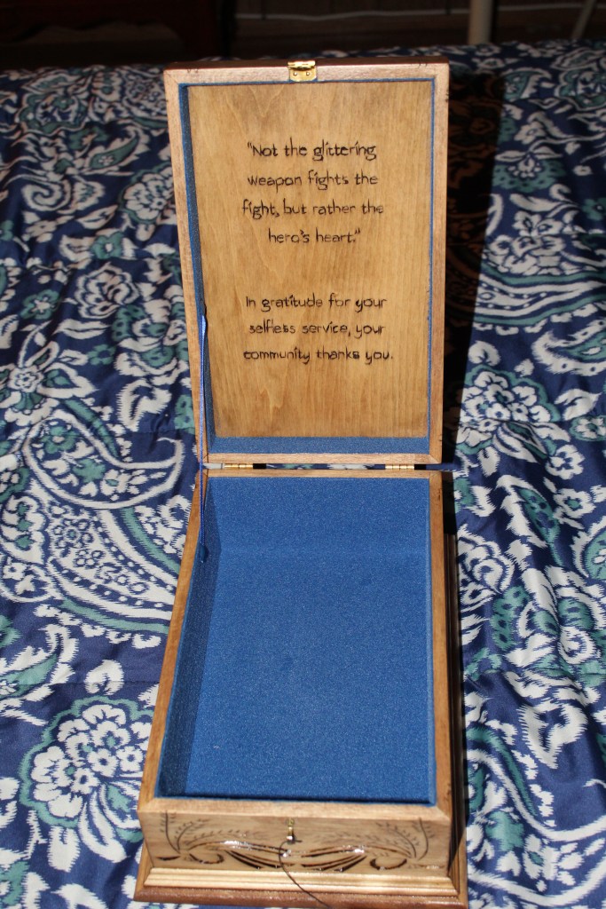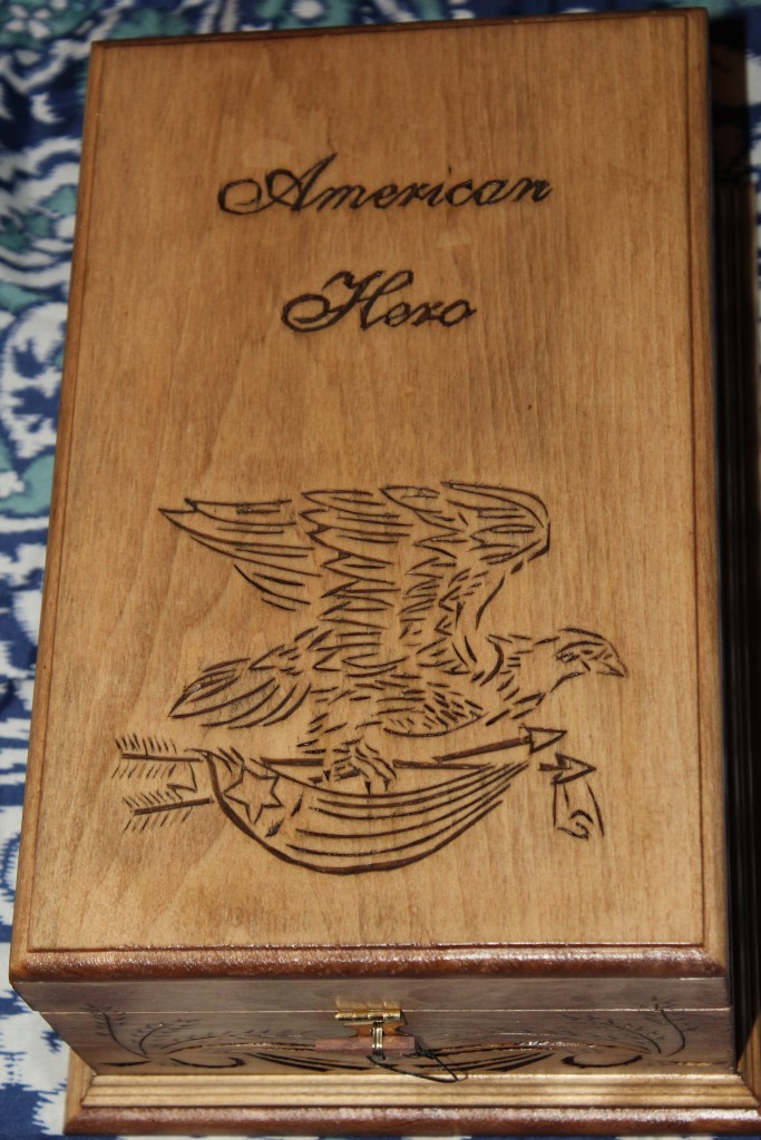 American Hero Box – Customer ordered this custom box to send to first responders who were injured in the line of duty, so that they may place within it get well cards they received from people who card about them and appreciated their sacrifices.