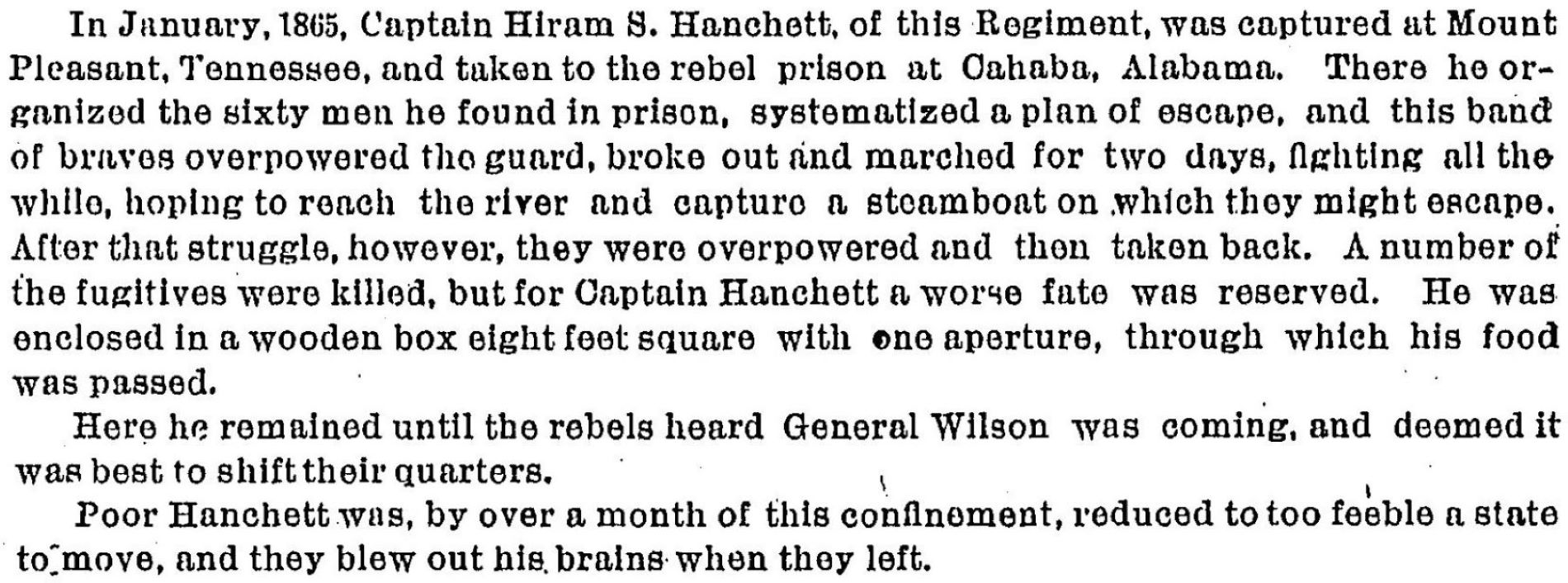 After the mutiny inquiry, seven men, including Captain Hanchett, were taken from the prison, marched into town to the county jail, where they were confined in what was referred to as “the dungeon.” The following day, all but Captain Hanchett were released. The following report is from the 1886 Report of the Adjutant General of the State of Illinois** by J. W. Vance, in the section on page 561 about the Sixteenth Cavalry: