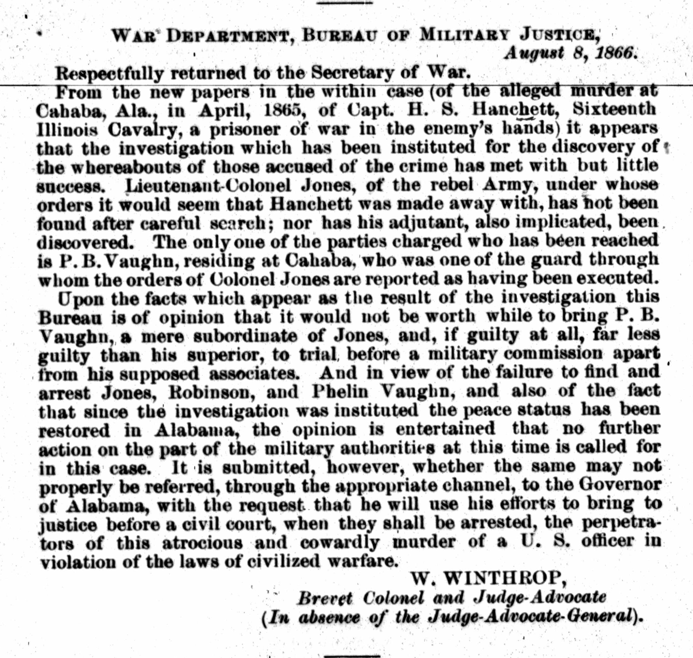 The location of Captain Hanchett’s remains is unknown. It is believed that after the murder was committed, he most likely was buried in the woods somewhere near Cahaba.