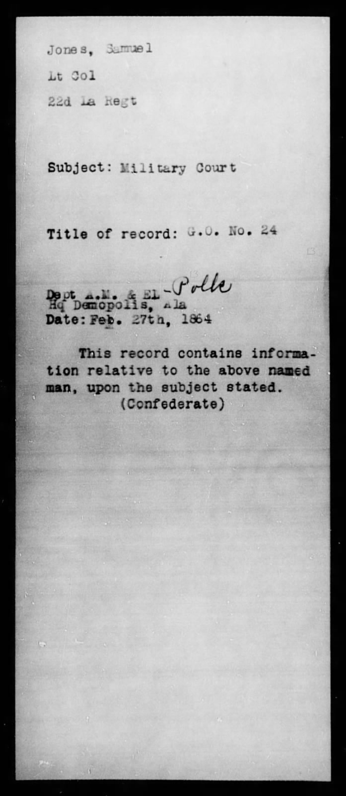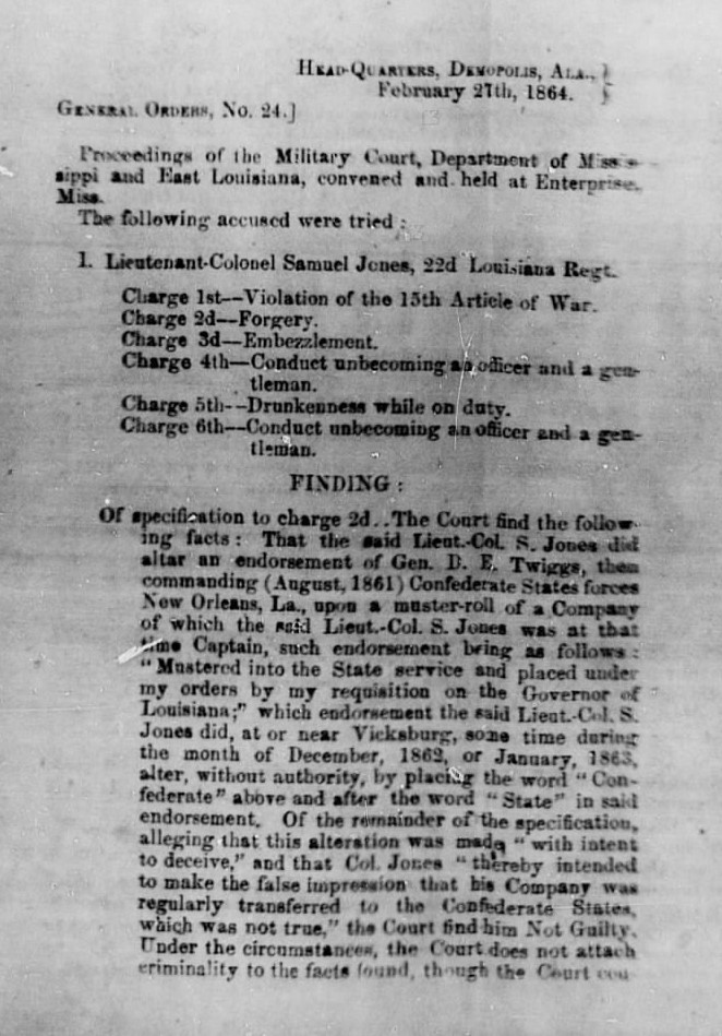On February 27, 1864, Jones was summoned to the Military Court of the Department of Alabama, Mississippi, and Eastern Louisiana. See the following: