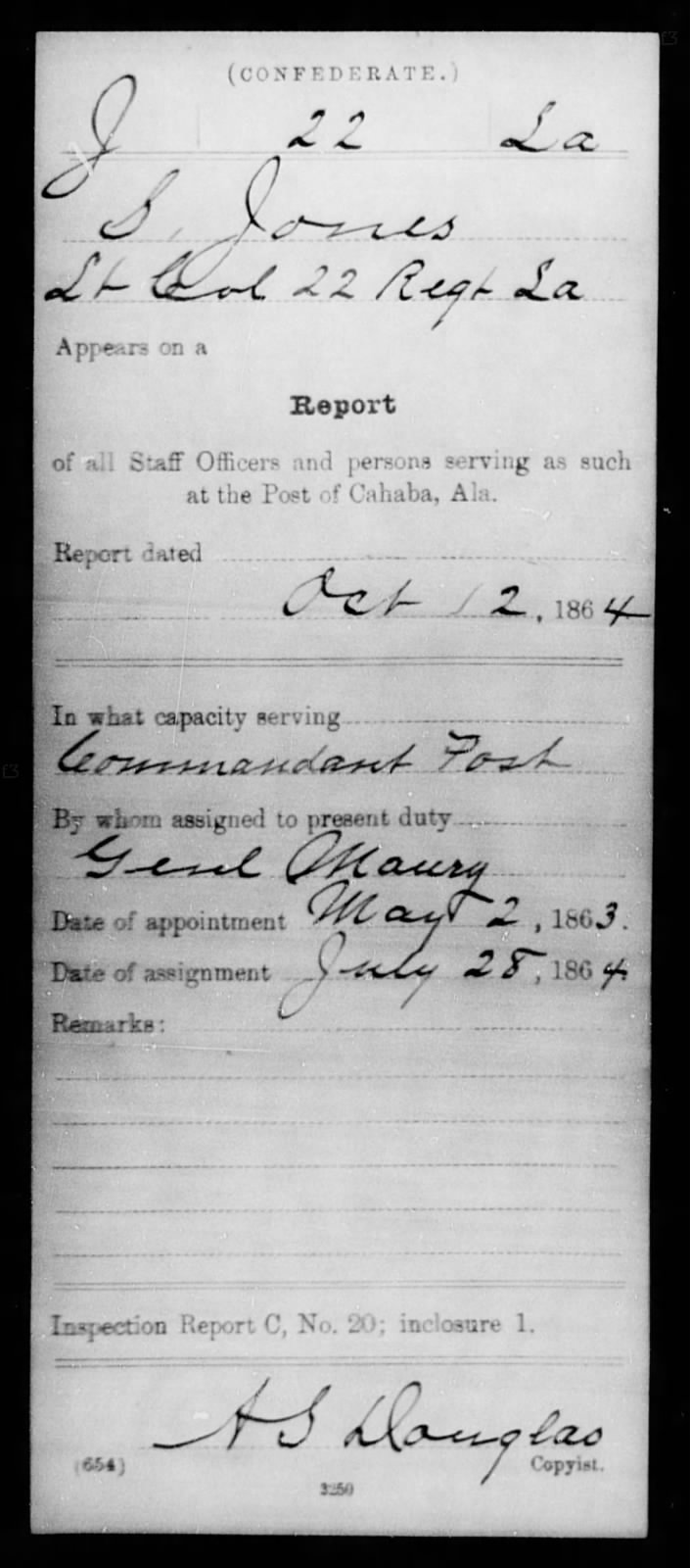 On October 12, 1864, Jones appeared on a report of “all Staff Officers and persons serving as such at the post of Cahaba, Ala. in the capacity serving as Commandant Post. Assignment date July 28, 1864.” Signed by General Maury. How he became Commandant of Cahaba Prison is a mystery. Brig. General John H. Winder, who was in command of military prisons in Alabama and Georgia, complained to Richmond that he had not requested Jones to Cahaba, nor did he want him there. The Inspector General’s office agree with Winder, and was against a divided command at Cahaba. No orders, assigning Jones as Commandant of Cahaba, were ever found.