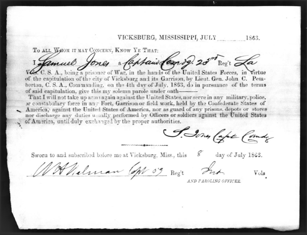 On July 4, 1863, Jones and his 22nd Louisiana Regiment were captured during the capitulation of Vicksburg, Mississippi. On July 8, 1863, Jones signed an Oath of Parole. This was the second time he was paroled. Note that even though he was promoted to Lt. Col. on May 2nd, the Oath of Parole showed Jones represented himself as a Captain, rather than a Lieutenant Colonel, and that he was in command of the 23rd Louisiana, rather than the 22nd Louisiana. This mistake ended any further chances of promotion, and losing any chances at promotion, Jones became bitter and began to drink heavily. He would later take his bitterness out on the prisoners in Cahaba Prison.