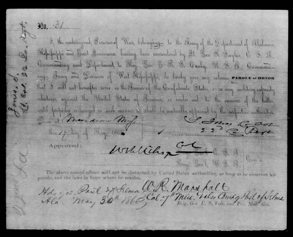 Finally, on May 17, 1865, at Meridian, Mississippi, Lt. Col. Jones signed a Parole of Honor (22nd LA Regiment). Signed by Brig. Gen. W.R. Marshall, U.S. Volunteers and Provost Marshal General on May 30, 1865, at Selma, Alabama. This is the third and last time Jones signed a Parole of Honor. This very fact shows how dishonorable a man Jones was.