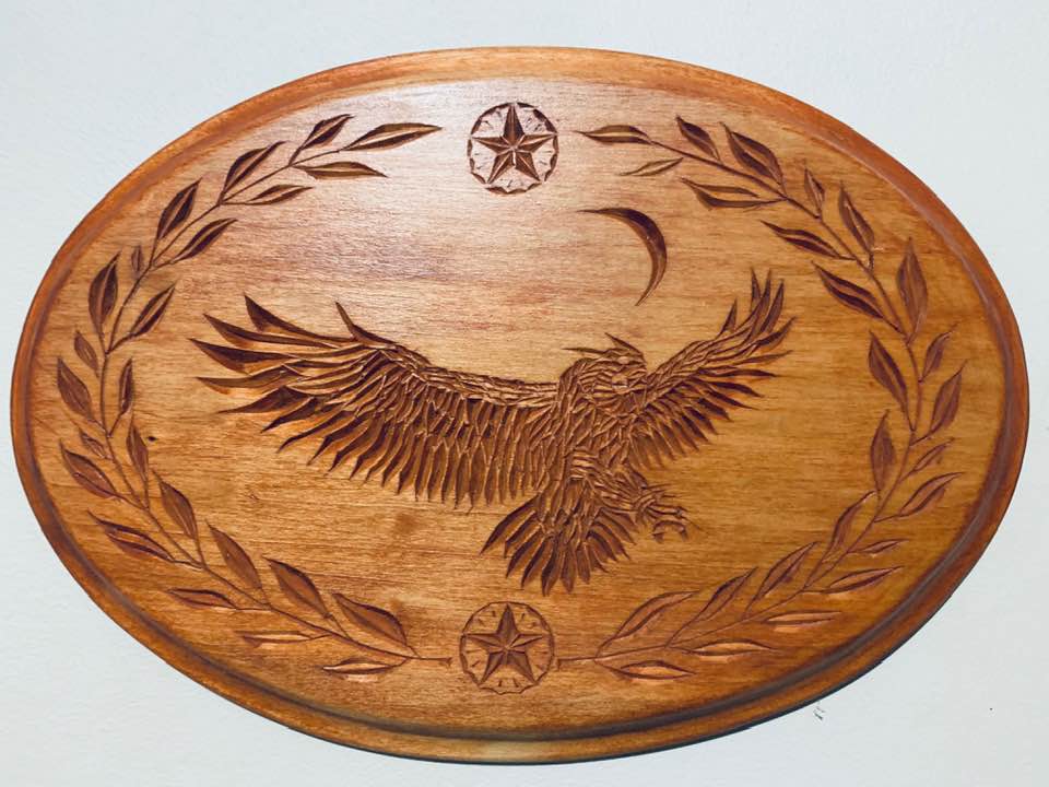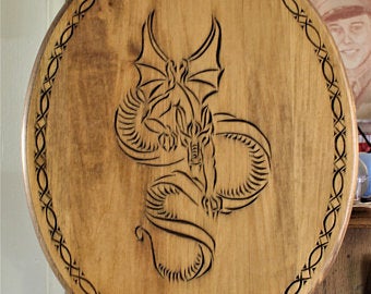Handmade and handcarved. Made to order. Raised flame made from bloodwood, and cross made from oak.